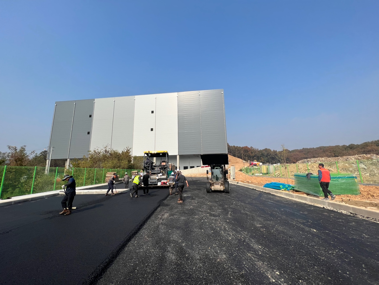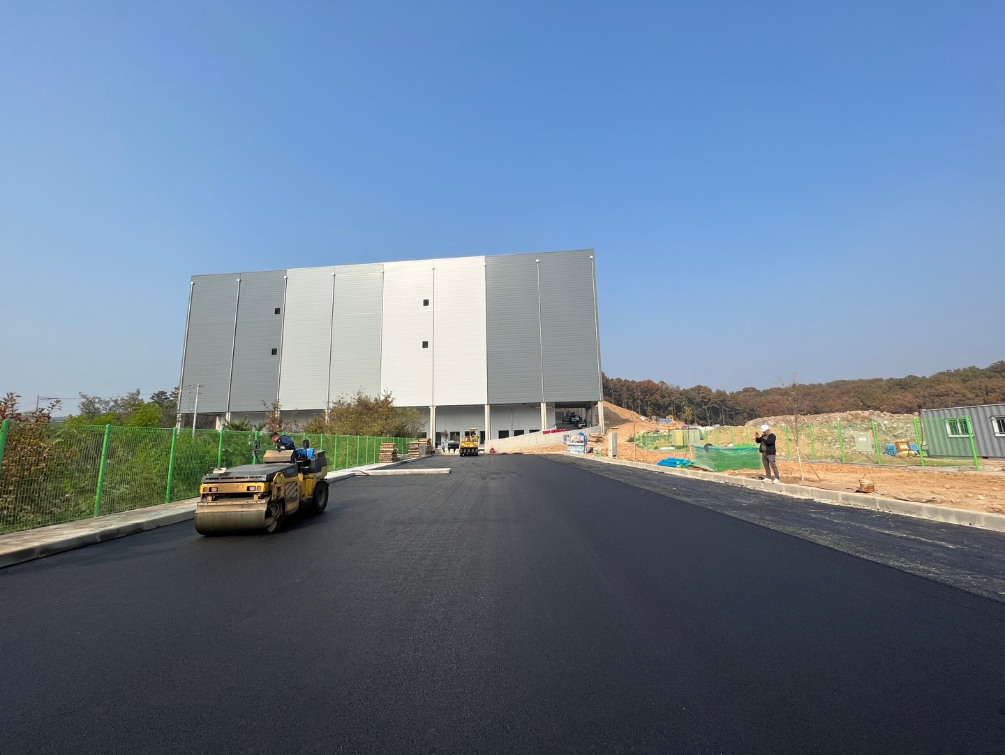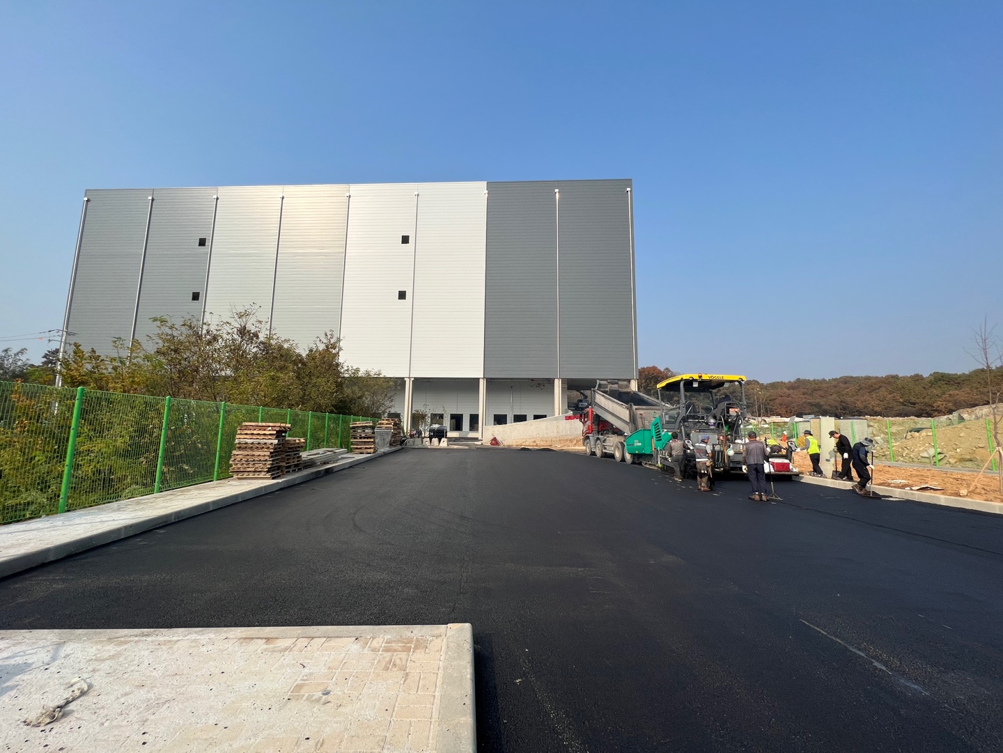 신축물류센터 물류 상·하차구역 및 출입로 전면 아스콘 포장 공사가 완료된 모습입니다.
