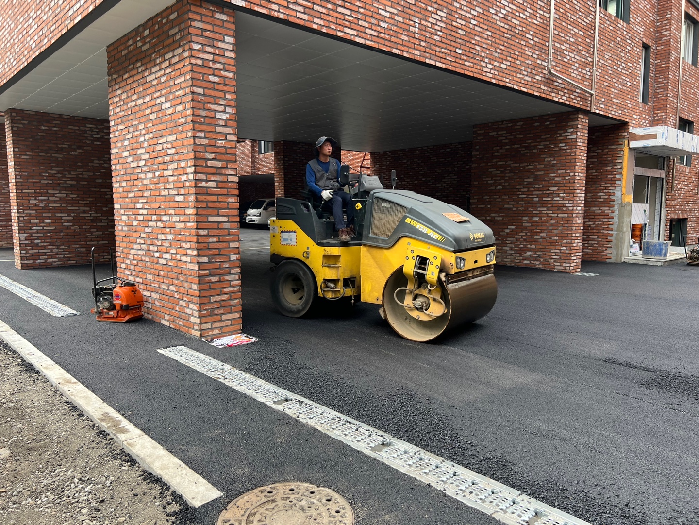 기층을 단단하게 만든 후 그 위에 아스콘 포장을 진행하겠습니다.