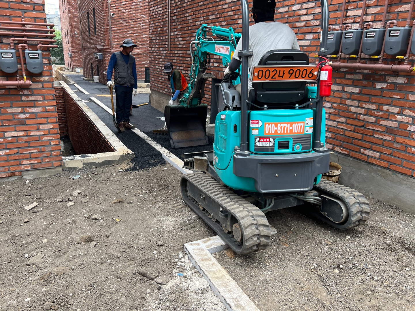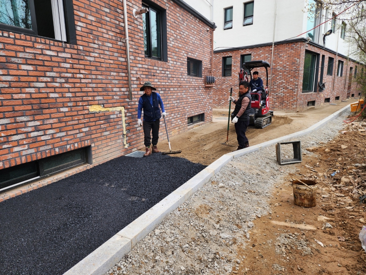 장비가 들어갈 수 없는 협소한 장소에는 작업자가 직접 삽과 갈퀴를 이용하여 포설하였습니다.