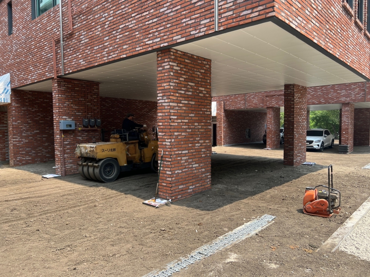 흙바닥 상태이므로 따로 파쇄작업 없이 골재 포설 및 다짐으로 지반을 단단하고 평평하게 만들어줍니다..