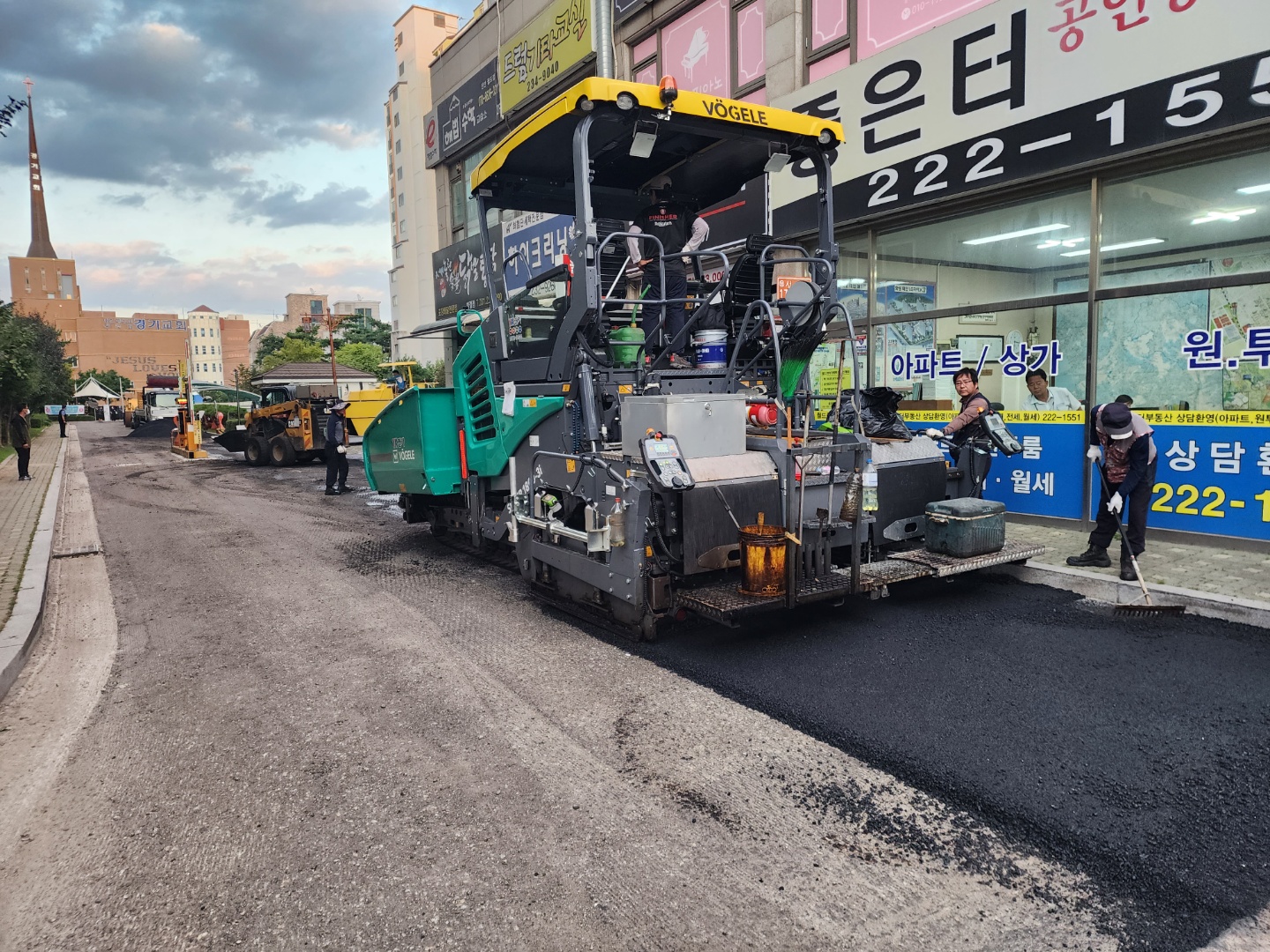 피니셔가 들어갈 수 없는 좁고 굽은 구간은 스키드 로더가 포설을 해주고 마감이 미흡한 부분들을 전문가들이 직접 수정하여 포설을 마무리해주었습니다.