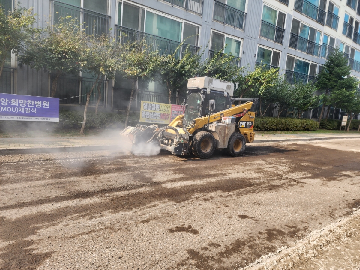 우선, 새로운 아스콘을 포설하기 전 노후된 아스콘을 파쇄하여 도로를 깔끔하게 정리해줍니다.