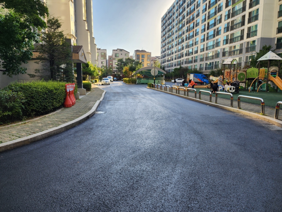 말끔하게 시공된 아스콘도로는 보행자와 차량통행시에 더욱더 안전하고 매끄러운 주행감을 선사할 것 입니다.