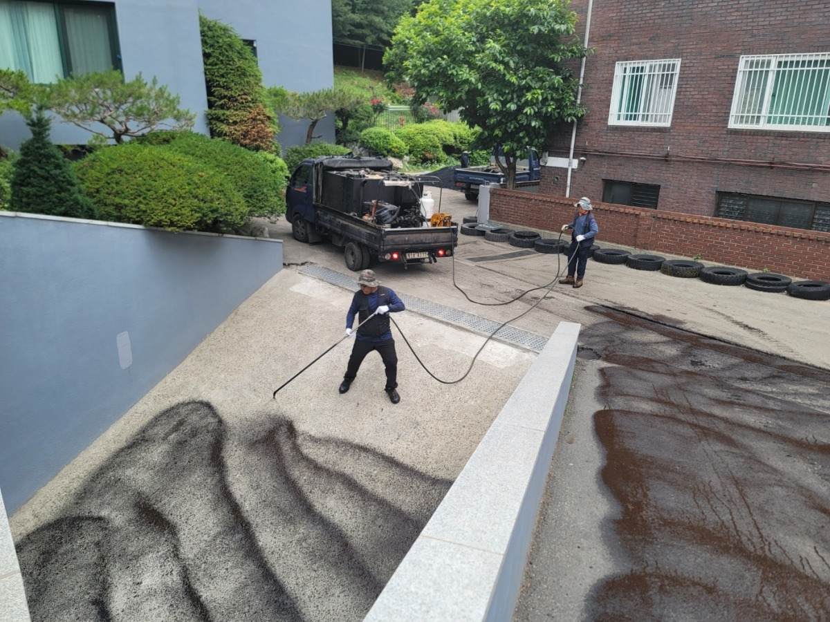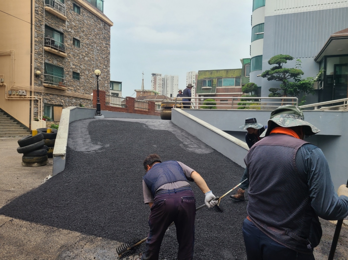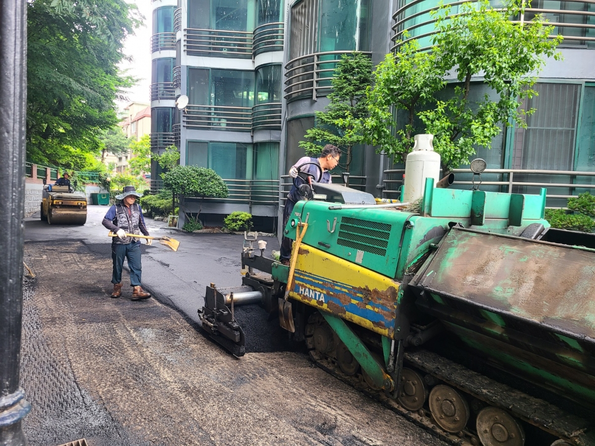 장마철 기존의 파열되고 울퉁불퉁하던 도로의 물이 고이던 모습은 사라지고 매끄러운 도로로 새롭게 단장되었습니다.