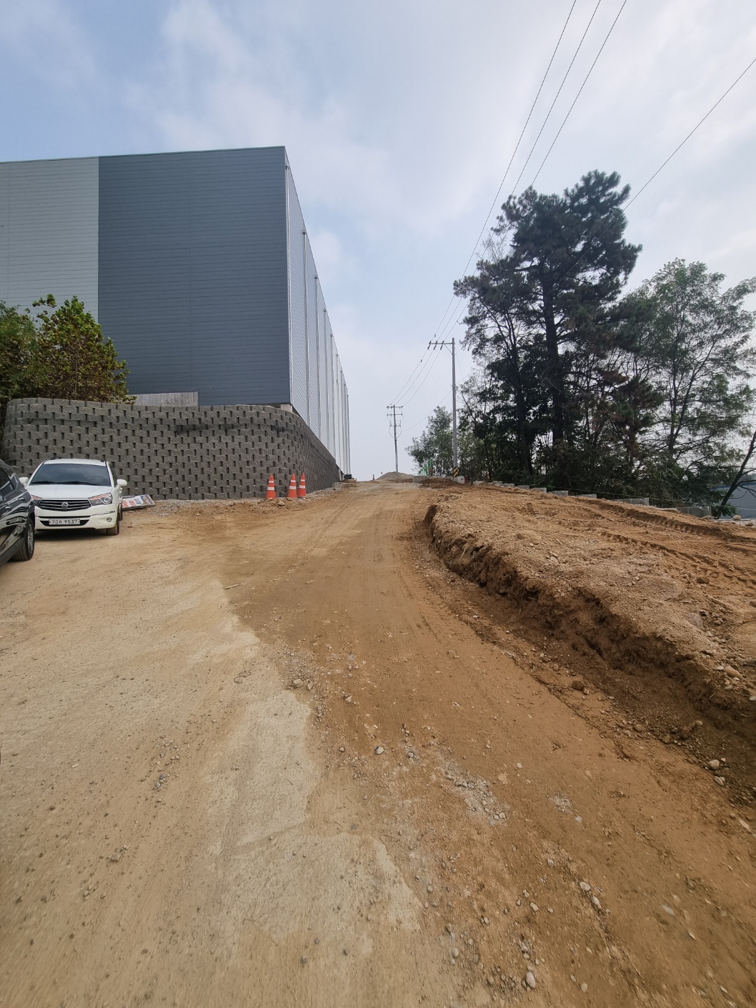 공사 전, 현장의 노면 상태는 콘크리트와 흙으로 덮여있어 차량 주행 시 비산먼지가 다량 발생하고 차량의 진동과 흔들림이 커지기 때문에 물류센터를 이용하는 차량과 작업자들의 기저질환 발생 또는 물류가 파손 되는 등의 불편함을 겪을 수 있는 환경입니다.