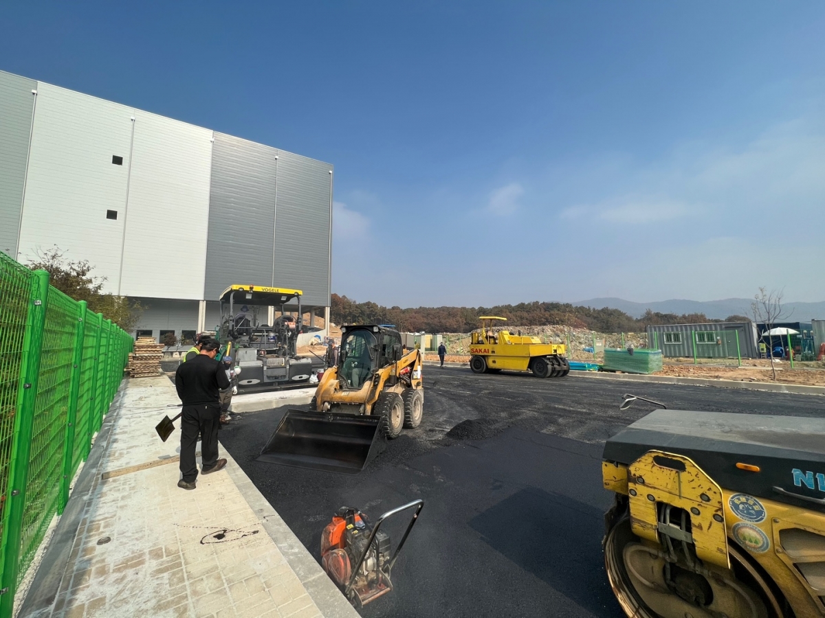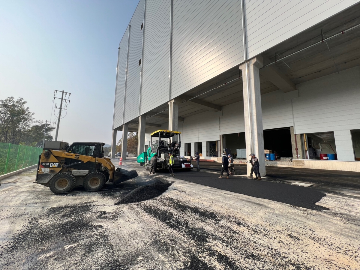 경기도 이천시에 있는 신축물류센터 물류 상·하차구역 및 출입로 전면 아스콘 포장 공사 현장 입니다.