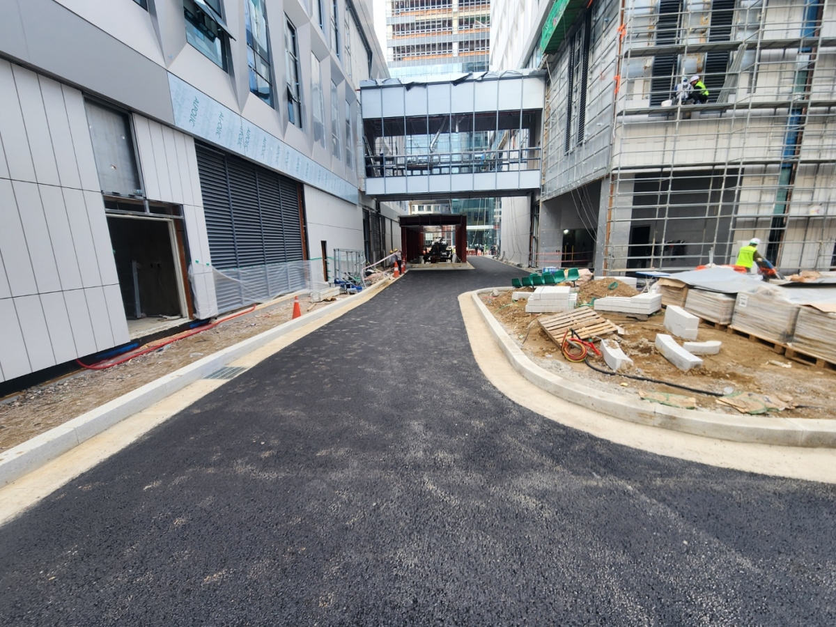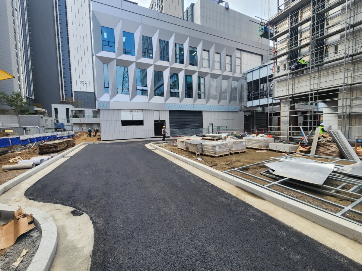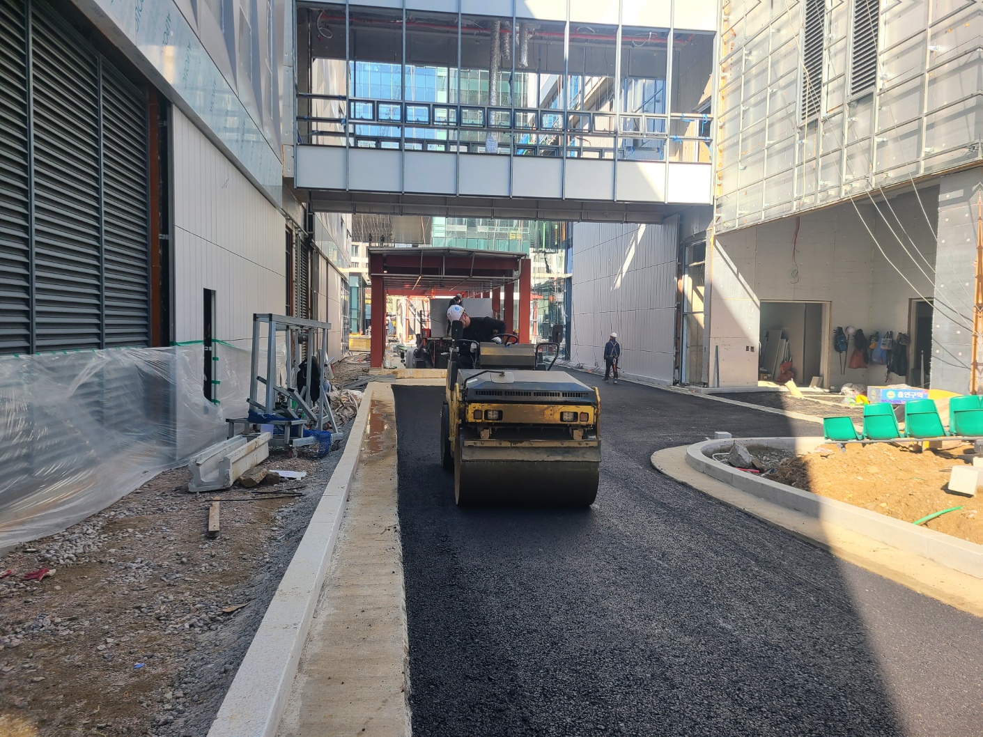 지식산업센터 진출입로 및 건물 내부 도로 아스콘 포장 공사가 완료되었습니다.