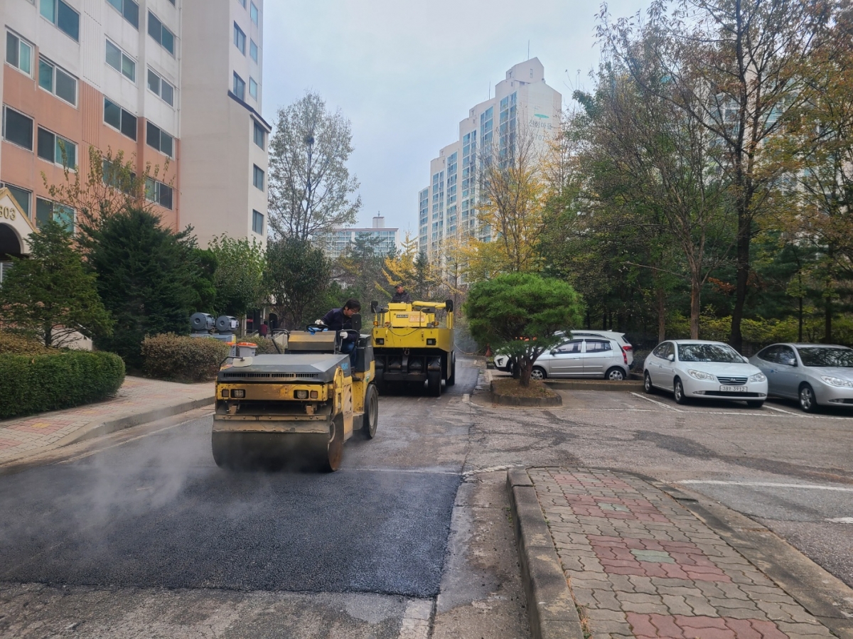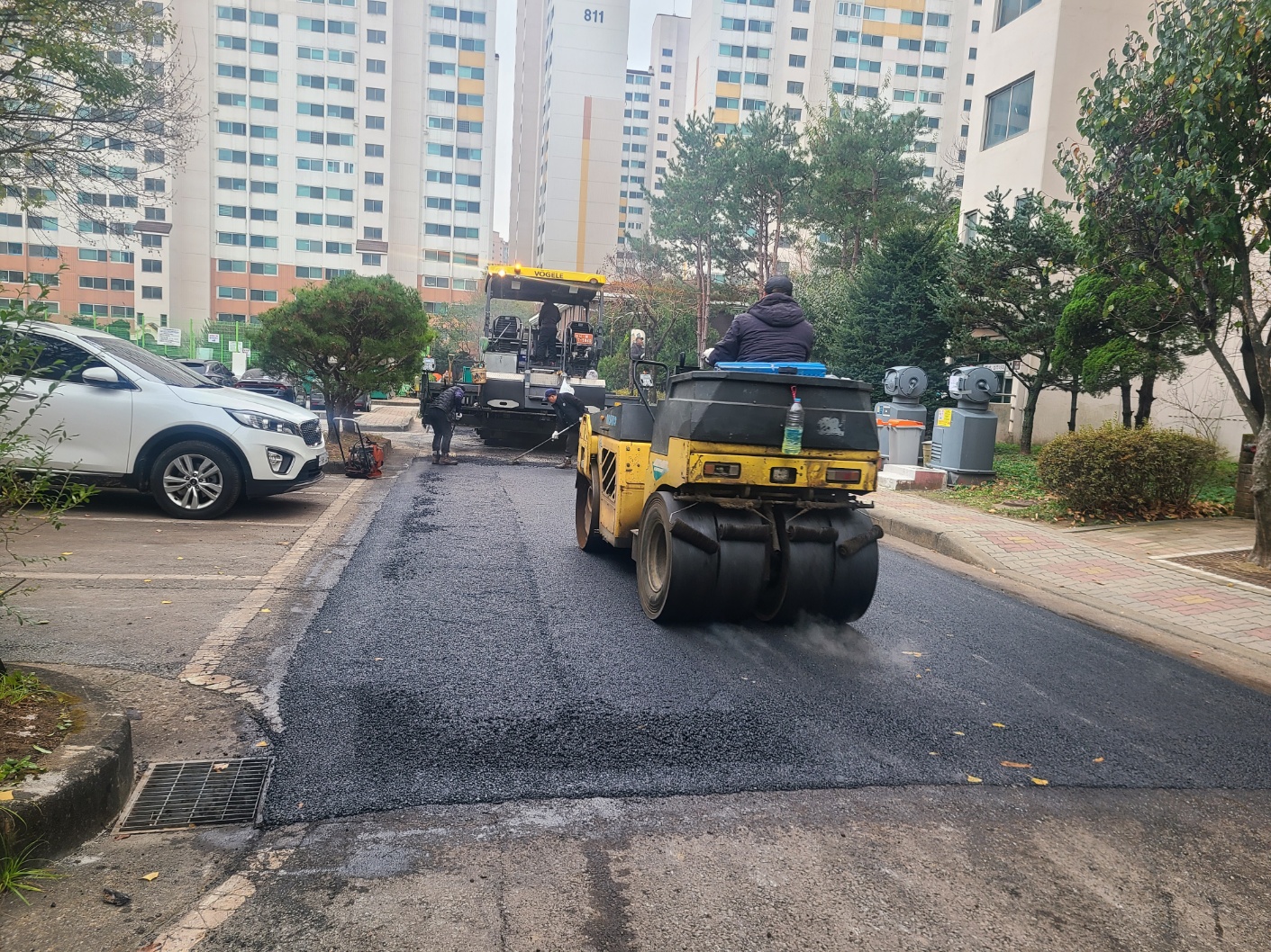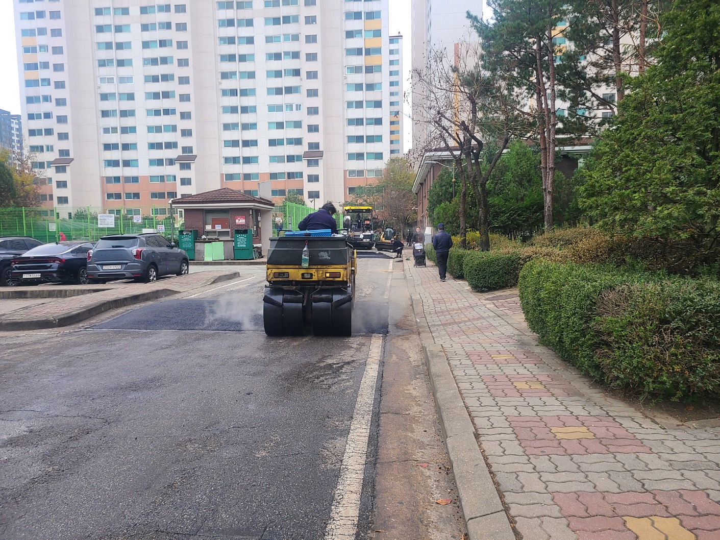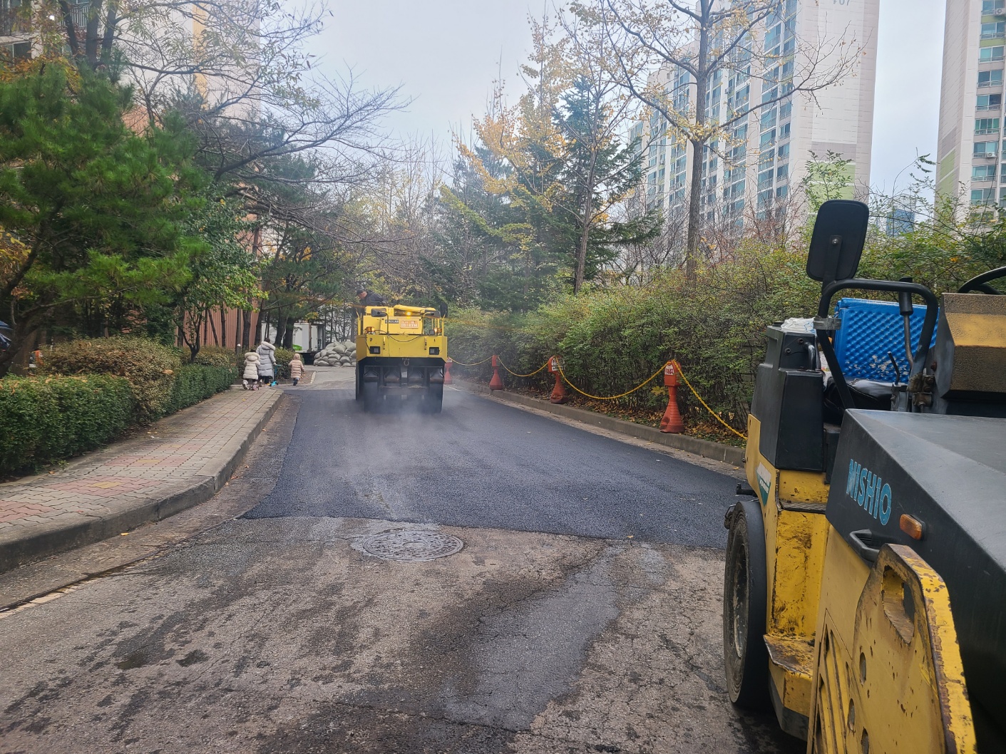 용인시에 위치한 수지현대성우 아파트 단지 내 도로 재포장 현장입니다.